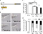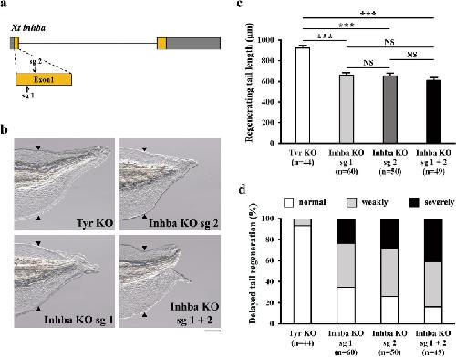 Figure 3. InhibinβA is required for tail regeneration. (a) Schematic drawing of sgRNA target sites (sg 1 and sg 2) in the inhba locus. Grey boxes, untranslated regions; orange boxes, coding regions; arrows, single-guide RNA target sites; bar, intron region. (b) Representative phenotypes of tyr KO (control), inhba KO sg 1, inhba KO sg 2, and inhba KO sg 1 + sg 2 tadpoles at 72 hpa. (c) The lengths of regenerating tails in KO tadpoles at 72 hpa. (d) Summary of phenotypes in KO tadpoles at 72 hpa. On the basis of the lengths of regenerating tails at 72 hpa, tadpoles were classified into three phenotypic groups (normal regeneration, weakly delayed regeneration, or severely delayed regeneration). Black arrowheads indicate amputation sites. Scale bar, 200 μm. NS, not significant; ***P < 0.001.