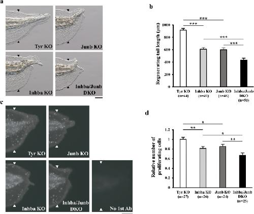 Figure 4. InhibinβA and JunB cooperate for regenerative outgrowth/cell proliferation. (a) Representative phenotypes of tyr KO (control), inhba KO, junb KO, and inhba/junb DKO tadpoles at 72 hpa. (b) The lengths of regenerating tails in KO and DKO tadpoles at 72 hpa. (c) Representative immunofluorescent images of pH3 staining (white dots) in KO and DKO tadpoles at 36 hpa. Whole-mount immunostaining was performed with the pH3 antibody; immunostaining without the pH3 antibody was used as a negative control (no 1st Ab). (d) Relative number of proliferating cells at 36 hpa. The number of pH3-positive cells was divided by the corresponding area. All values were normalized against the value of tyr KO. Black and white arrowheads indicate amputation sites. Scale bars, 200 μm. *P < 0.05, **P < 0.01, ***P < 0.001.