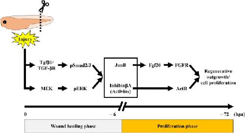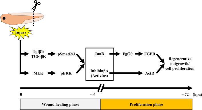 Figure 7. A model for the transition from wound healing to regenerative cell proliferation mediated by InhibinβA and JunB. Upon tail amputation, Tgfβ1/TGF-β receptor (TGF-βR) and MEK independently phosphorylate/activate Smad2/3 (pSmad2/3) and ERK (pERK), respectively. These injury-activated signals coordinately induce the expression of inhba and junb during the wound healing phase. After wound healing, InhibinβA and JunB cooperate to initiate outgrowth and cell proliferation. Mechanistically, JunB promotes tail regeneration, at least in part, via Fgf20/FGF receptor (FGFR) signaling; InhibinβA/Activin receptor (ActR) signaling may act either in parallel with or downstream of Fgf20/FGFR signaling (see Discussion).