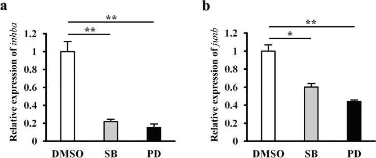 Figure 1. The expression of inhba and junb is regulated by injury-activated signaling during wound healing. qRT-PCR analysis of inhba (a) and junb (b) expression in DMSO (control), SB-505124 (SB), and PD0325901 (PD)-treated tails. The regenerating tails were isolated at 1 and 2 hpa for the expression of junb and inhba, respectively. The data were normalized against expression of rps18, and then by the value of DMSO. *P < 0.05, **P < 0.01.
