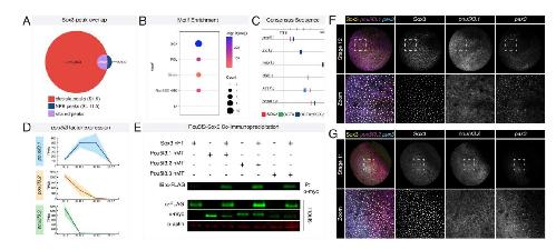 enrichment. (E) Venn diagram showing overlap (maroon) between blastula stem cell transcriptome (gray) and Sox3 peaks in blastula stem cells (red). (F) GO term analysis
