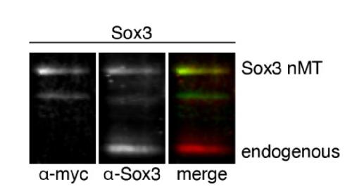 ChIP-seq experiments. Western blot for myc (green) and Sox3 (red) in embryos