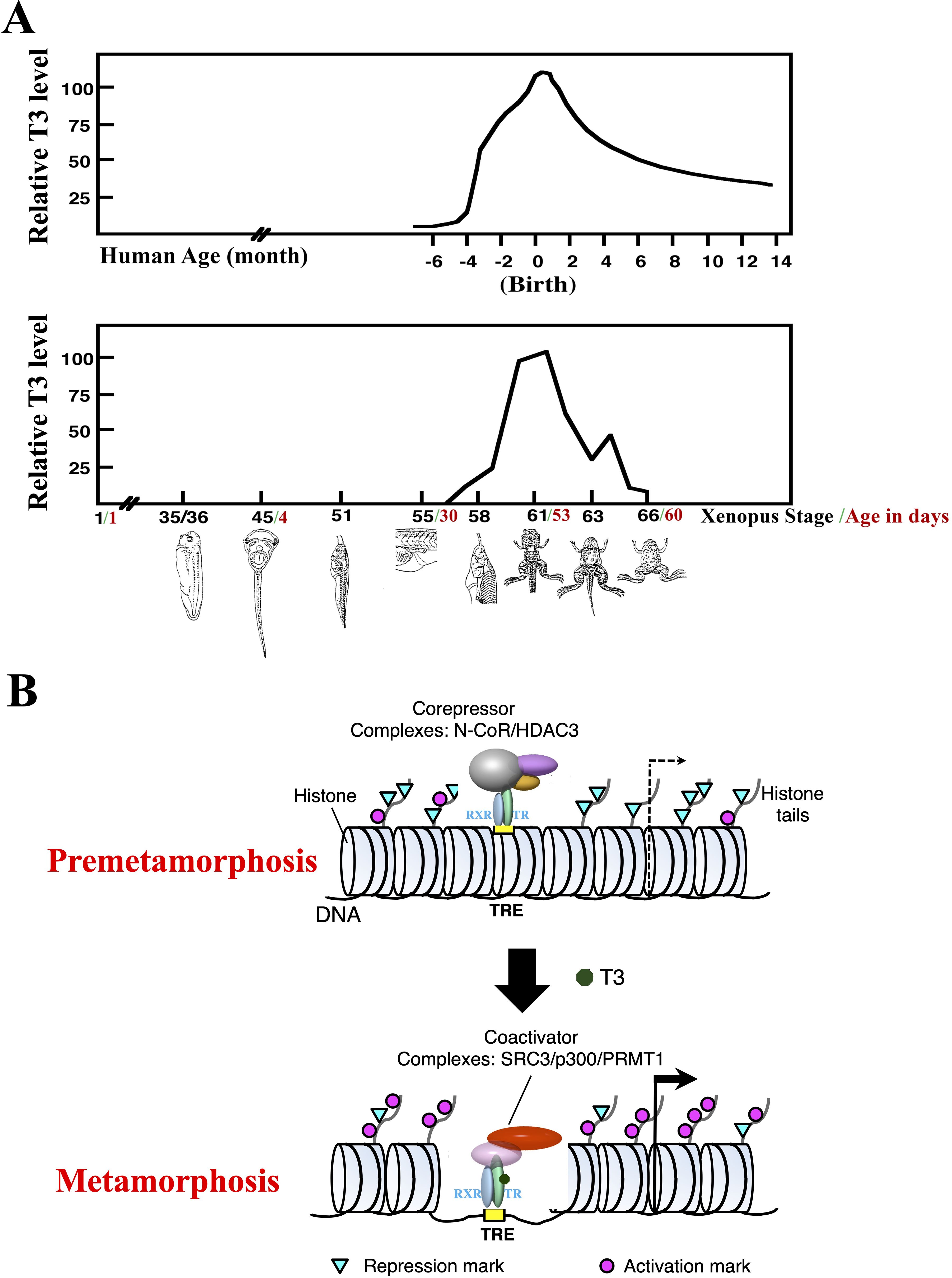 Figure 1. T3 is critical for postembryonic development by regulating transcription through TR. (A) Plasma T3 levels during human and Xenopus development (with peak level set to 100 for each species). Frog metamorphosis, which takes place between stage 54 to stage 66, roughly the second month of Xenopus development, transforms essentially every single tissue/organ of a tadpole as the animal changes into a frog. Metamorphosis shares many similarities with postembryonic development in human, a period of about 4 months before to several months after birth when most organs/tissues mature into adult forms. Of note, plasma T3 level peaks during both metamorphosis in frog and postembryonic development in human (1). (B) A dual function model for TR during Xenopus metamorphosis. During premetamorphosis (before stage 54), there is little or no T3 present and thus most TRs are in the unliganded state and TR/RXR heterodimers bind to TREs in chromatin to recruit HDAC-containing corepressors complexes to target genes. This leads to reduced levels of activation histone marks and increased levels of repression histone marks to facilitate repression of the target genes. During metamorphosis, T3 binds to TRs, which in turn releases corepressor complexes and recruit coactivator complexes to cause chromatin remodeling, including the loss of 2–3 nucleosomes around the TRE and changes in histone modifications, e.g., increased activation histone marks and decreased repression histone marks, to facilitate transcriptional activation of target genes. |