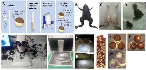 Fig. 3. Design of in-cell NMR experiments on NA targets in Xenopus oocytes. (A) The experiment can be viewed as a series of steps leading to an in-cell NMR readout. These include preparing the NA stock solution, microinjection into Xenopus laevis stage VI oocytes, assembly of the in-cell NMR sample, in-cell NMR data acquisition, and sample post-processing addressing the physiological relevance of the in-cell NMR readout. (B) 1-year-old adult female frog. (C) Surgical incision after harvesting of oocytes from a 3-year-old frog. (D) Oocyte samples immediately after microsurgery. (E) Instrumental setup for manual injection consists of a preparative microscope and microinjection apparatus. (F) Robotic injection device. (G) A detailed view of manual injection: oocytes to be injected are placed and immobilized in a Petri dish and submerged in Orisingle bondCa2+ buffer. (H) A detailed view of the multi-well plate used for the robotic injection of oocytes; each well contains a single oocyte. (I) An in-cell NMR sample; an NMR tube filled with about 250 oocytes. (J) Viable stage VI oocytes injected with NA; (J') Viable injected oocytes after progesterone treatment (arrows mark white spots indicative of matured oocytes); (J") Non-viable oocytes after injection. |