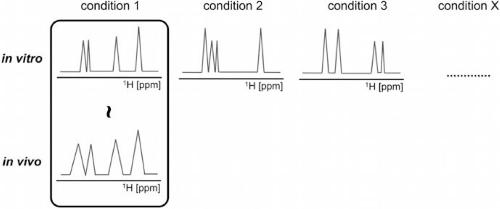 Fig. 5. Schematic outline of interpretational process based on comparison of spectral fingerprints between in-cell and various in vitro conditions. The in vitro conditions are employed to generate different structural arrangements of nucleic acid fragments under study. Environmental factors such as molecular crowding, viscosity, pH, type of counterion, and temperature are typically varied to promote distinct folding topologies in the studied sequence. Each unique fold is associated with a corresponding spectral fingerprint, which is subsequently compared with the spectral fingerprint recorded under physiological conditions in cells. Figure adapted with permission from Hänsel et al. [39]. Copyright 2012 Springer. |