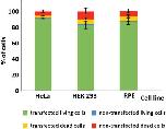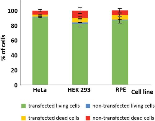Fig. 10. HeLa cells are resilient to “harsh” treatment connected to the preparation of in-cell NMR samples and tolerant to high levels of introduced exogenous DNA required for NMR-based detection. HeLa, HEK293, and RPE cells were electroporated with 12-nt dsDNA, d(GCTGATATCAGC)2, and viabilities and transfection efficiencies were monitored using FCM. |
