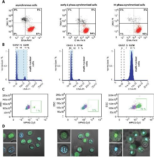 Fig. 16. Illustrative comparison of the controls for in-cell NMR experiments in asynchronous (LEFT) and early-S phase (MIDDLE) and mitosis (RIGHT) synchronized cells. (A) Double-staining (Genomic DNA-PI/DNA target-FAM) FCM analysis reporting of transfection efficiency and viability of HeLa cells after transfection of DNA i-motif-based construct. (B) FCM-based analysis of propidium iodide (PI) stained DNA content of fixed and permeabilized cells, providing quantitative information on synchronicity of cells in the in-cell NMR sample. (C) FCM-based analysis of anti-MPM2-stained cells, providing supplementary information on the population of mitotic cells. (D) Confocal microscopy images reporting on intracellular localization of the introduced FAM-labelled DNA target. Green and blue colors indicate the localization of FAM-labelled DNA and Hoechst-stained nuclear DNA, respectively. The figure was adapted with permission from [28]. Copyright 2024 from Viskova et al. under the terms of the Creative Commons CC BY license. (For interpretation of the references to colour in this figure legend, the reader is referred to the web version of this article.) |