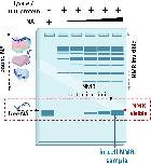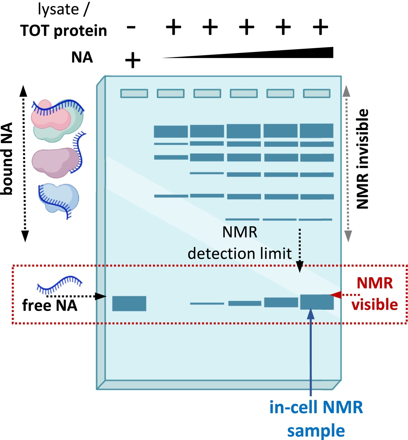 Fig. 2. Schematic of a native PAGE experiment showing exogenous NA target from lysates of transfected cells to illustrate the concept of target overrepresentation. The introduced NA target interacts with endogenous intracellular factors (proteins) to form high molecular-weight complexes that are generally invisible to NMR. To allow for specific observation of freely tumbling NA targets, the target must be delivered at concentrations higher than those necessary to saturate the endogenous factors, so as to achieve levels of freely tumbling NA molecules above the NMR detection limit. |