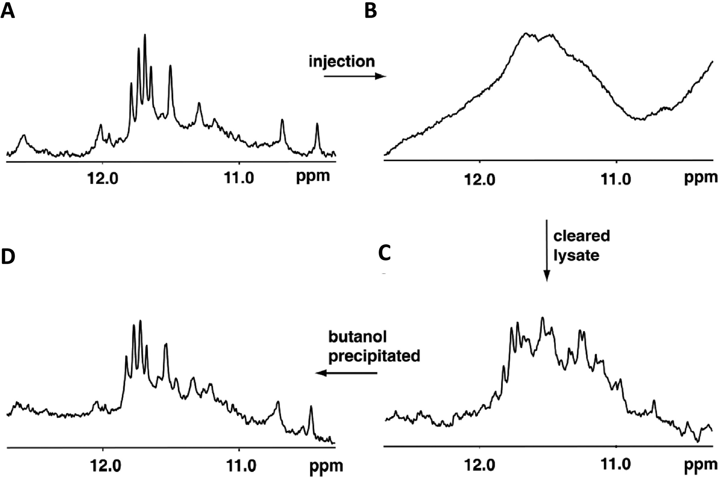 Fig. 8. Illustrative example of the degradation control experiment. Imino regions of the 1D 1H NMR spectra of d(G3(TTAG3)3T) in intracellular buffer (A), injected oocytes (B), cleared lysate (C), the intracellular buffer after butanol recovery of DNA from the cleared lysate (D). Note the evident difference between spectral fingerprints in the intracellular buffer (A) and the cleared lysate (C). While the spectrum in the buffer corresponds to a single conformation, namely to the 2-tetrad anti-parallel basket, the spectrum in the lysate suggests the coexistence of multiple G-quadruplex conformations. The matching between the spectral patterns (A) and (D) confirms that observed differences between in vitro and in-cell/clear lysate spectra are not due to DNA degradation. Figure adapted with permission from Hänsel et al. [13]. Copyright 2009 American Chemical Society. |
