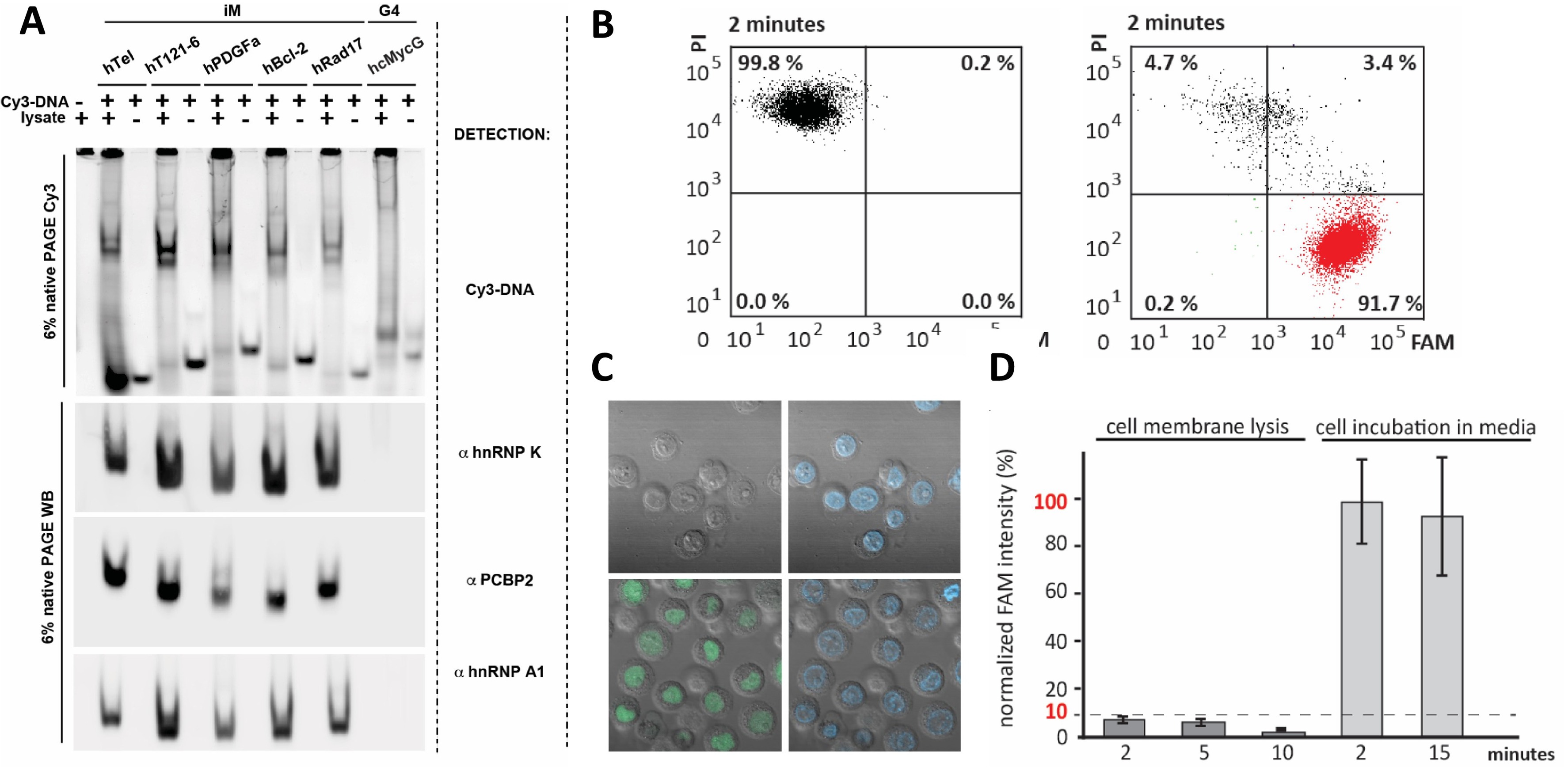 Fig. 17. Introduced DNA localizes in the cell nucleus and binds to (nuclear) proteins: (A) The gel from native PAGE (Polyacrylamide Gel Electrophoresis) to compare electrophoretic retardation of Cy3-labelled DNA i-motif-based fragments in a buffer and in crude cellular lysate from HeLa cells. In the upper part of the panel (6 % native PAGE Cy3), DNA in the gel is visualized via the Cy3-fluorescent label; the lower (faster running) bands in this view correspond to unbound DNA, the higher (slower running) bands visible only in the lanes with lysate present correspond to DNA in complex with proteins from the lysate. The lower part of the panel (6 % native PAGE WB) shows Western Blot experiments to identify the protein components of these complexes; immunostaining of proteins transferred to the PVDF membrane from the native PAGE gel, using antibodies to hnRNP K, PCBP2, and hnRNP A1, demonstrates that proteins involved are nuclear. (B) However, the delivered DNA localized in the cell nucleus is not completely immobilized by nuclear components: selective disruption of the cell membrane leads to leakage of the DNA from the cell nucleus; (B) shows double-staining (PI/FAM) of the cells treated with the cell membrane-disrupting buffer (LEFT) and a control experiment performed in the presence of growth medium (RIGHT). (C) The analogous situation as in (B) was also captured using confocal microscopy: cells transfected with NA-target 2 min after treatment with the cell membrane-disrupting buffer (TOP) or 2 min after the incubation in growth media (BOTTOM). The green colour (LEFT) indicates the localization of the NA target, while the blue colour (RIGHT) corresponds to a cell nucleus stained by Hoechst. (D) Quantification of FAM (NA target) fluorescence in cells treated with the cell membrane-disrupting buffer and in cells incubated in the presence of the medium (control). The figure from (A) was adapted with permission from [28]. Copyright 2024 from Viskova et al. under the terms of the Creative Commons CC BY license.