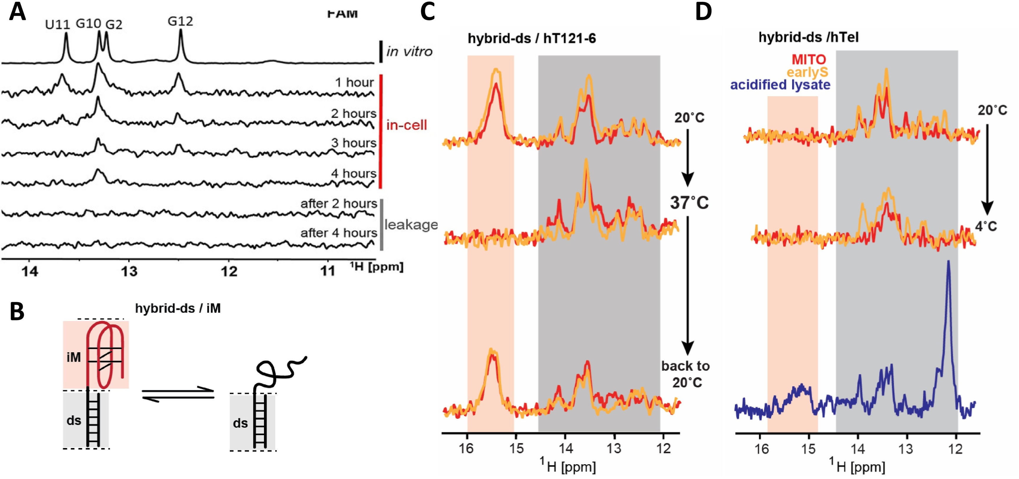 Fig. 19. Controls are required to interpret the absence of signals in 1D 1H in-cell NMR spectra. The absence of an NA signal in the spectrum can be caused by NA target (partial) degradation, NA target incorporation in high-molecular-weight complex(es), or intracellular environment-induced unfolding. (A) In-cell NMR spectra of HeLa cells transfected with 14-mer RNA hairpin, r(GGCACUUCGGUGCC), acquired as a function of time. Gradual signal decay, absence of RNA signals in the surrounding medium (leakage), and inability to observe recovered RNA from cleared cellular lysate by butanol precipitation (data not shown) indicate the absence of signal observed after 4 h is due to RNA degradation. (B) Schematic representation of the hybrid DNA construct consisting of a double-stranded (ds) DNA region (grey) and an i-motif (iM) forming segment (red). The in-cell NMR signals from the (relatively) environmentally insensitive ds segment serve as an internal reference to monitor iM segment folding/unfolding. (C) and (D) show imino regions of 1D 1H NMR spectra of two distinct hybrid DNA constructs, hybrid/hT121–6 and hybrid/hTel, respectively. Both hybrid constructs consist of identical double-stranded segments (corresponding signals are highlighted in the grey box) and different 5′-single-stranded protrusions (hT121–6 and hTel) that can fold into a DNA i-motif (i-motif specific signals are highlighted in the pink box). For the hT121–6, the absence of the i-motif signals in the in-cell NMR spectrum acquired at 37 °C can be attributed to unfolding because the i-motif signals can be recovered by reducing the temperature to 20 °C (C). In contrast, for the significantly less stable hTel i-motif, formation of which cannot be induced even at 4 °C (D), the unfolding is confirmed only after the in-cell NMR sample is processed into crude cellular lysate followed by acidification, leading to recovery of the i-motif specific signal (D). The in-cell NMR spectra displayed in red and orange were acquired from cells synchronized in the cell cycle's M- and early S-phase, respectively. The fig. (A) was adapted with permission from [22]. Copyright 2021 from Broft et al. under the terms of the Creative Commons CC BY 4.0 license. The figs. (B and C) were adapted with permission from [28]. Copyright 2024 from Viskova et al. under the terms of the Creative Commons CC BY license. (For interpretation of the references to colour in this figure legend, the reader is referred to the web version of this article.) |
