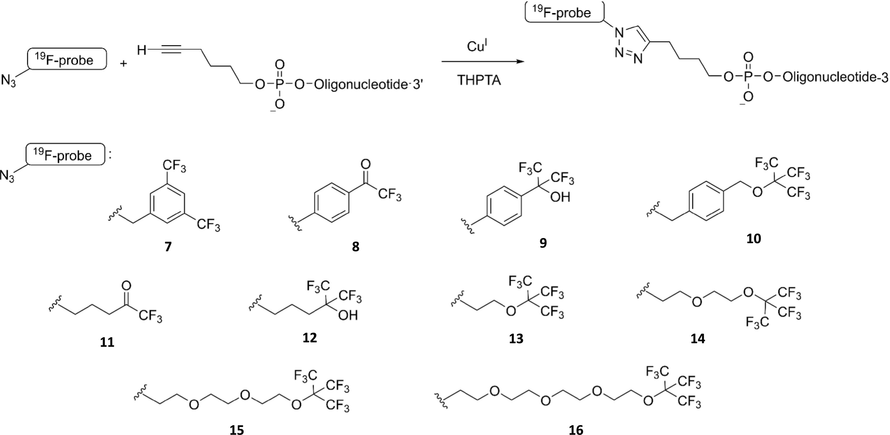 Fig. 23. A post-synthetic approach to modify oligonucleotide targets with 19F-based probes. (TOP) Schematic representation of a post-synthetic labelling approach based on a CuAAC coupling of a fluorine-containing azide with 5′-terminally alkynylated oligonucleotide. (BOTTOM) examples of fluorinated azide-based derivatives suitable for (in-cell) 19F NMR applications (cf. [117]); 3,5-bis(trifluoromethyl)benzylazide (7), 1-(4-azidophenyl)-2,2,2-trifluoroethanone (8), 2-(4-azidophenyl)-1,1,1,3,3,3-hexafluoropropan-2-ol (9), 4-.