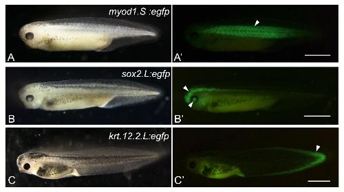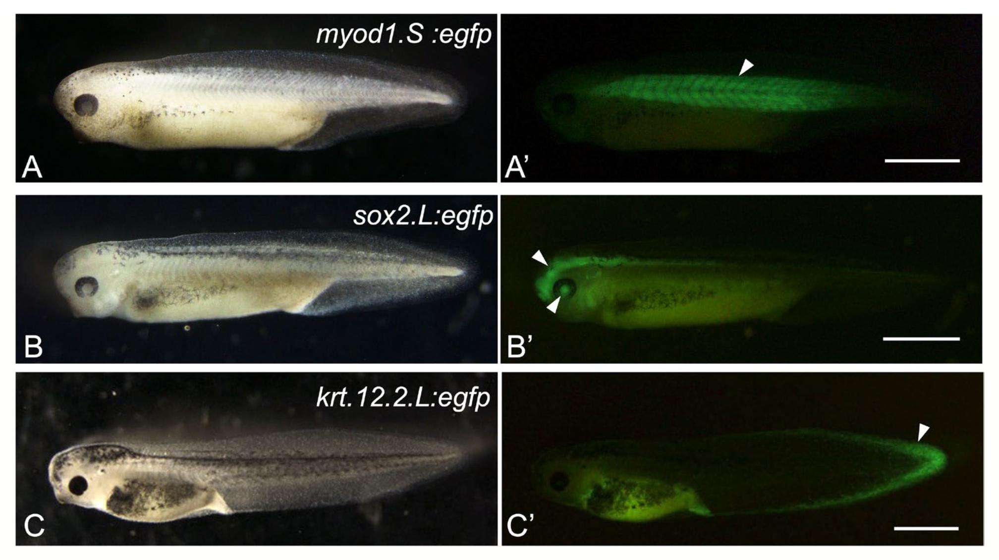FIGURE 2 | Expression of eGFP in knock- in vector injected embryos. Representative images of embryos targeted for myod1.S (A, A', NF stage 35/36), sox2.L (B, B′, NF stage 37/38) and krt12.2.L (C, C′, NF stage 41) loci. (A‑C), bright field images. (A'‑C′), fluorescence images of (A‑C). Clear eGFP signal was observed in somatic muscle (arrowhead in A'), brain and lens (arrowheads in B′), and fin (arrowhead in C′). Scale bar = 1 mm.