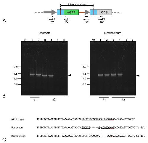 FIGURE 4 | Genotyping of F1 animals. (A) Scheme of an integrated target locus. PCR was performed with genomic DNAs obtained from F1 animals. Upstream and downstream sequences, including junctions between the donor and the target regions, were amplified using donor vector primers and gene- specific primers. Primer sequences are listed in Table S1. (B) Examples of PCR analysis for sox2.L:Egfp F1 embryos obtained from the founder #1 (1, 2) and founder #2 (3–6). PCR products for both upstream and downstream junction fragments were observed in DNAs from F1 embryos with specific eGFP expression (1–4) but not from embryos with ubiquitous eGFP (5, 6) or wild- type embryos (wt). Predicted sizes of the upstream and downstream PCR fragments are indicated as arrowheads. PCR products with larger or smaller sizes indicate insertion or deletion in the junctions. (C) Example of upstream and downstream junction sequences. The PCR products of sox2.L:Egfp F1 embryo (lane 3) were sequenced directly. Determined sequences are indicated with the wild- type partial sequence of the 5′ UTR. Underline indicates the sgRNA target sequence with PAM sequence (red underline).