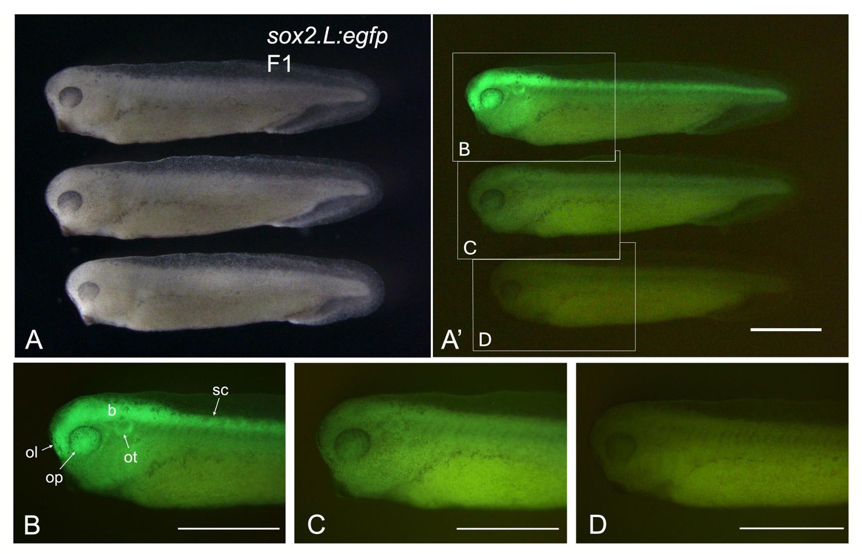FIGURE 3 | Expression of eGFP in F1 siblings of sox2.L:Egfp. Representative images of F1 embryos (NF stage 33/34) obtained by crossing a female sox2.L:Egfp founder #2 (Table 3) and a wild- type male (A‑D). (A) bright field images. (A'), fluorescence image of (A). (B‑D) magnified view of each embryo in (A'). (B) specific eGFP signal is observed in brain (b), spinal cord (sc), optic vesicles (op), olfactory pit (ol), and otic vesicles (ot). (C) Ubiquitous eGFP signal at a low level is observed. (D) No eGFP signal is observed. Scale bar = 1 mm.