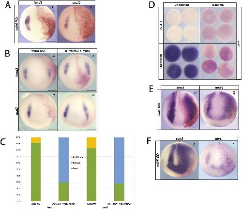 Fig. 2. Morpholino-mediated knockdown shows that wdr5 is required for NC gene expression. (A) Morpholino-mediated depletion of wdr5 inhibits neural crest factor expression. (B) Expression of wdr5 mRNA rescues morpholino-mediated neural crest gene expression. (C) Quantification of rescue percentage for the experiment shown in B. (D) Morpholino-mediated depletion of wdr5 prevents pluripotent blastula cells from being reprogrammed to neural crest state. (E) Morpholino-mediated depletion of wdr5 does not inhibit expression of NPB and neural plate factors. (F) Knockdown of wdr5 leads to an expansion of the neural plate factor sox3 and loss of myc expression at neurula stages. Asterisks indicate the injected side of the embryo. Scale bars: 250[micrometers]. Abbreviations [[MO = morpholino]] |