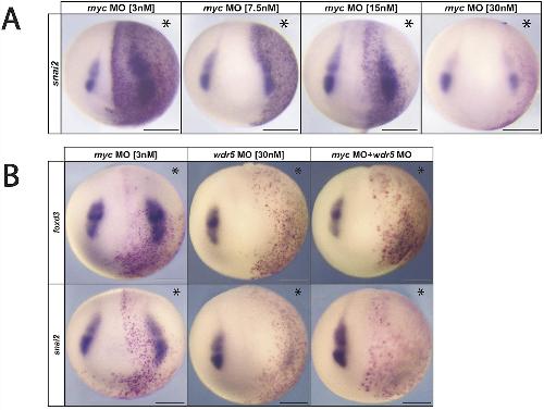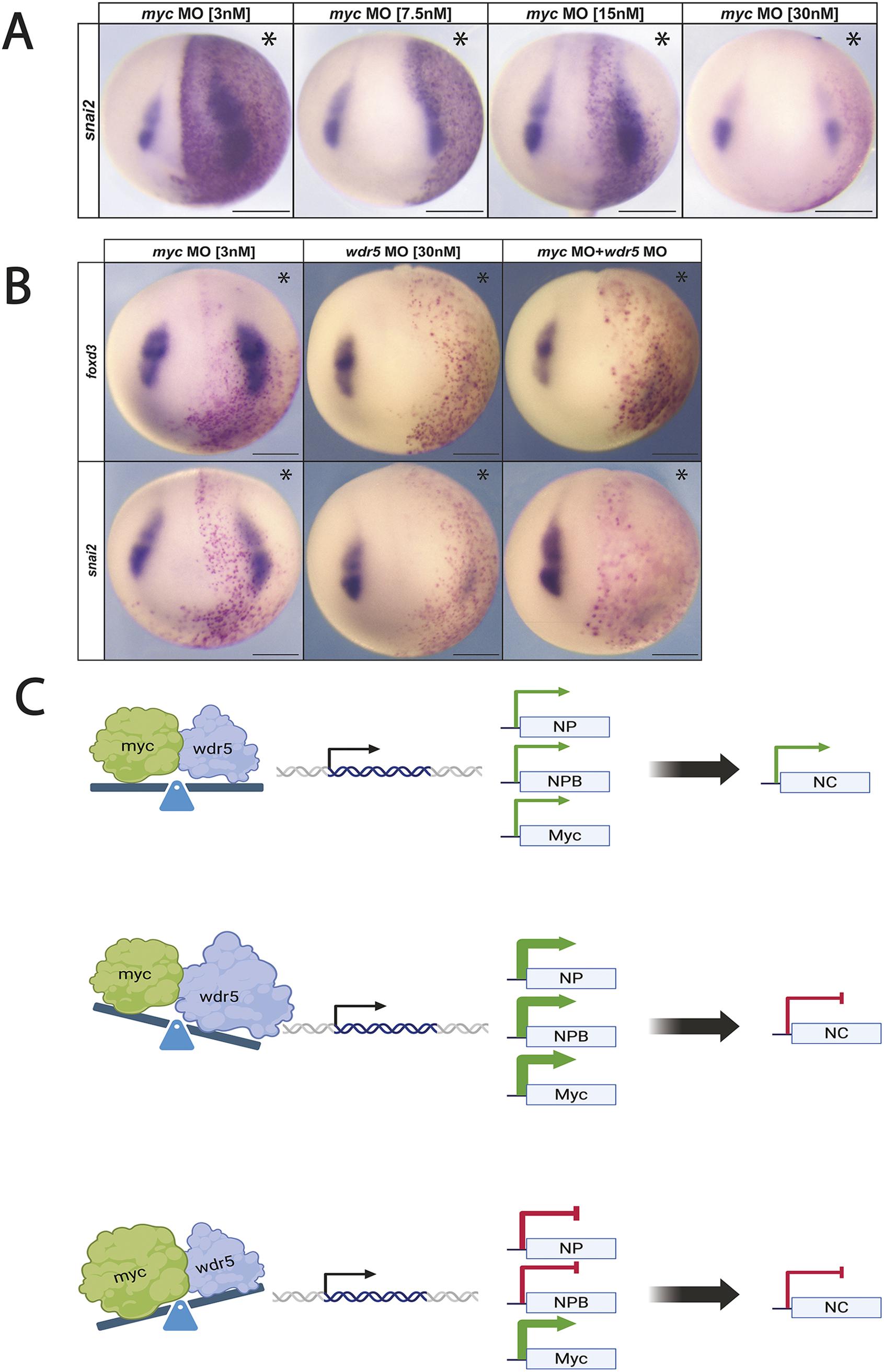 Fig. 7. Myc downregulation expands neural crest expression via a Wdr5-mediated mechanism. (A) Lower concentrations of myc MO expand neural crest factor expression. (B) wdr5 is required for myc MO-mediated expansion of neural crest gene expression. (C) Model depicting Wdr5- and Myc-mediated regulation of the neural crest: normal neural crest (NC) formation (top), loss of NC and prolonged neural plate (NP) and NPB (middle), loss of NC and prolonged Myc expression (bottom). Asterisks indicate the injected side of the embryo. Scale bars: 250[micrometers]. Abbreviations [[NC = Neural Crest; NP = Neural Plate; NPB = Neural Plate Border]] |
