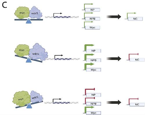 Fig. 7. Myc downregulation expands neural crest expression via a Wdr5-mediated mechanism. (C) Model depicting Wdr5- and Myc-mediated regulation of the neural crest: normal NC formation (top), loss of NC and prolonged NP and NPB (middle), loss of NC and prolonged Myc expression (bottom). Abbreviations [[NC = Neural Crest; NP = Neural