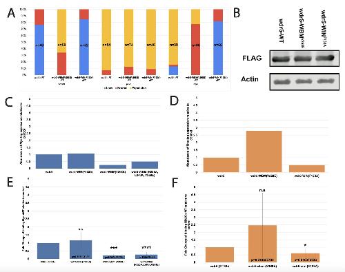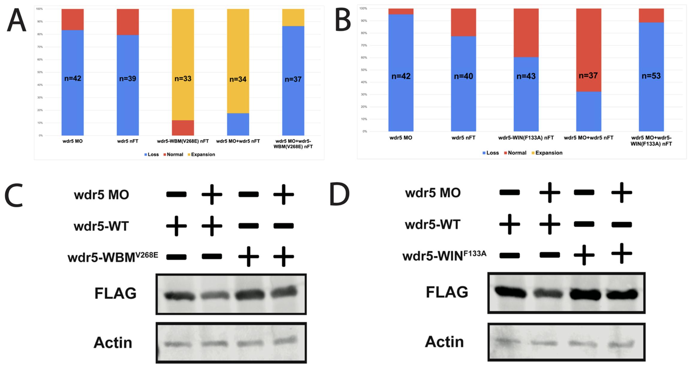 wdr5-WBMV268E nFT, wdr5 MO+wdr5 nFT, and wdr5 MO+wdr5-WBMV268E injected embryos. (B) Percentage bar graph representing whole embryo phenotype counts for wdr5 MO, wdr5 nFT, wdr5-WINF133A nFT, wdr5 MO+wdr5 nFT, and wdr5 MO+wdr5-WINF133A inject-ed embryos. (C) Western blot showing equivalent expression of wdr5-WT and wdr5-WBMV268E in the absence of endogenous wdr5 expression. (D) Western blot showing equivalent expression of wdr5-WT and wdr5-WINF133A in the absence of endogenous wdr5 expression. Abbreviations [[ MO = morpholino ]]. |
