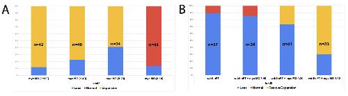 Fig. S6. (A) Percentage bar graph representing whole embryo phenotype counts for myc MO injected embryos at varying concentrations. (B) Percentage bar graph representing whole embryo phenotype counts for embryos injected with either wdr5 nFT, wdr5 nFT+myc MO at varying concentrations. Abbreviations [[ MO = morpholino ]]. |