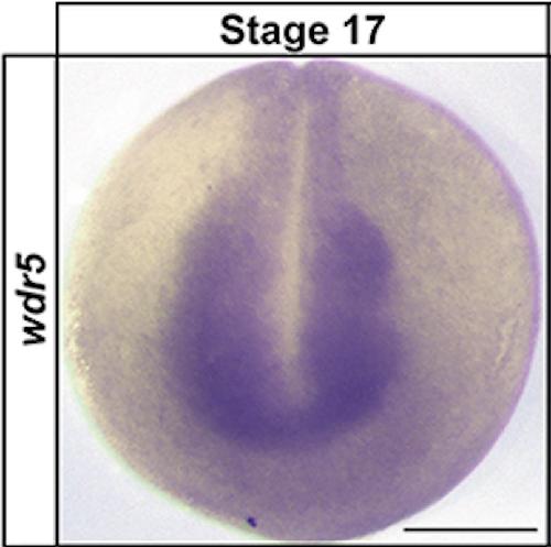 wdr5 (WD repeat domain 5) gene expression in X. laevis embryo, NF stage 11, assayed via in situ hybridization. |