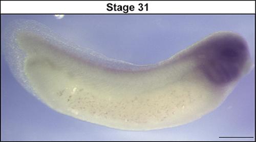 wdr5 (WD repeat domain 5) gene expression in X. laevis embryo, NF stage 29/30, assayed via in situ hybridization, lateral view, anterior right, dorsal up. |