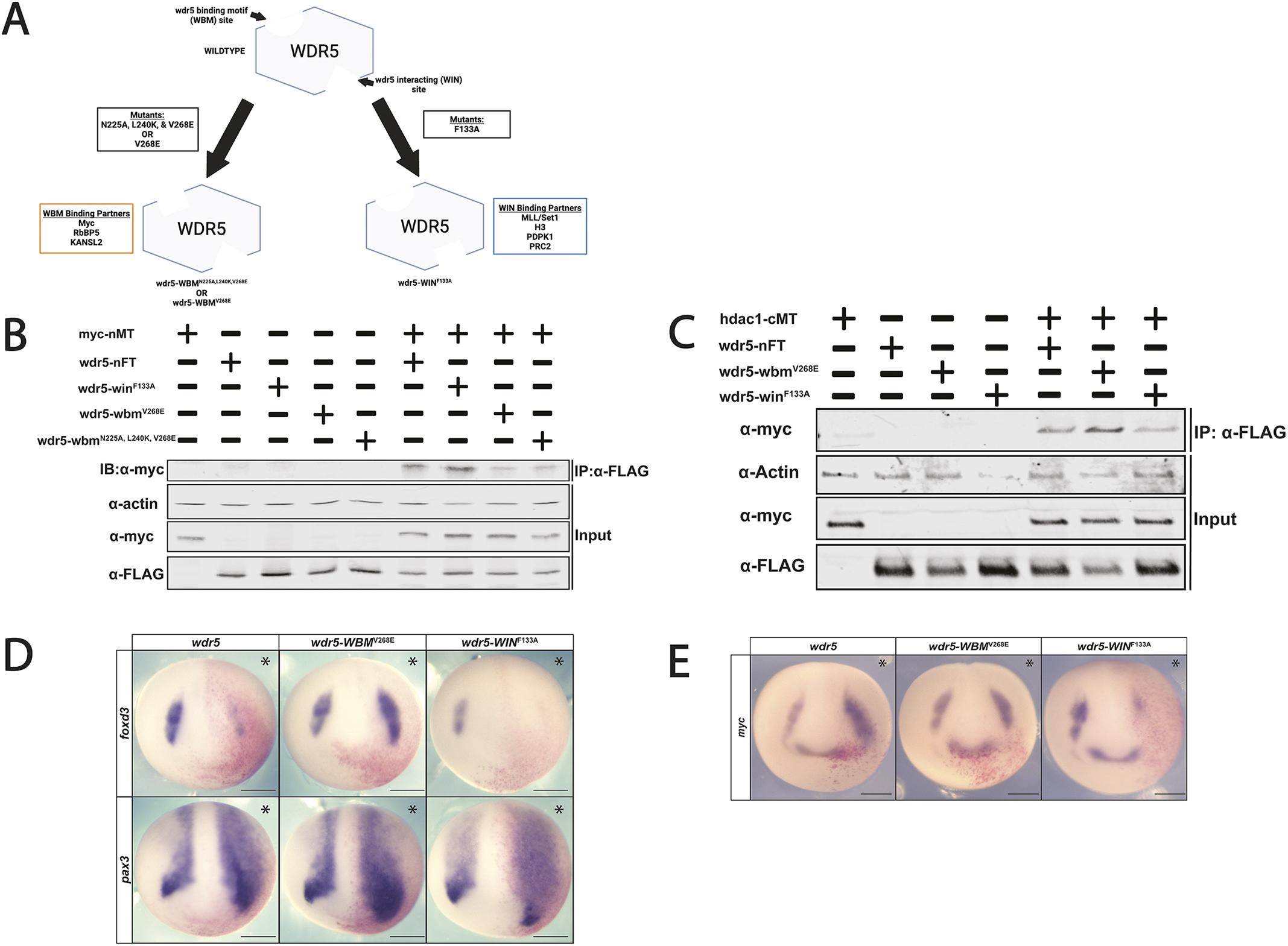 Fig. 5. Mutations in conserved binding sites on Wdr5 differentially affect neural crest gene expression. (A) Wdr5 function is primarily mediated through two conserved and distinct binding sites, the Wdr5 binding motif (WBM) and the Wdr5 interacting domain (WIN), both of which can be disrupted by point mutations. (B) Western blot showcasing disruption of binding of Myc to Wdr5-WBMV268 and Wdr5-WBMN225A,L240K,V268E in Xenopus embryos. (C) Western blot showcasing disruption of binding of Hdac1 to Wdr5-WINF133A in Xenopus embryos. (D) wdr5-WBMV268 leads to an expansion of neural crest gene expression when expressed at levels that lead to loss of neural crest gene expression in wdr5 and wdr5-WINF133A embryos. Overexpression of wdr5 and all resultant mutants expand NPB factor expression. (E) wdr5 mutant overexpression differentially affects myc expression compared to wild-type wdr5. Asterisks indicate the injected side of the embryo. Scale bars: 250[micrometers]. |