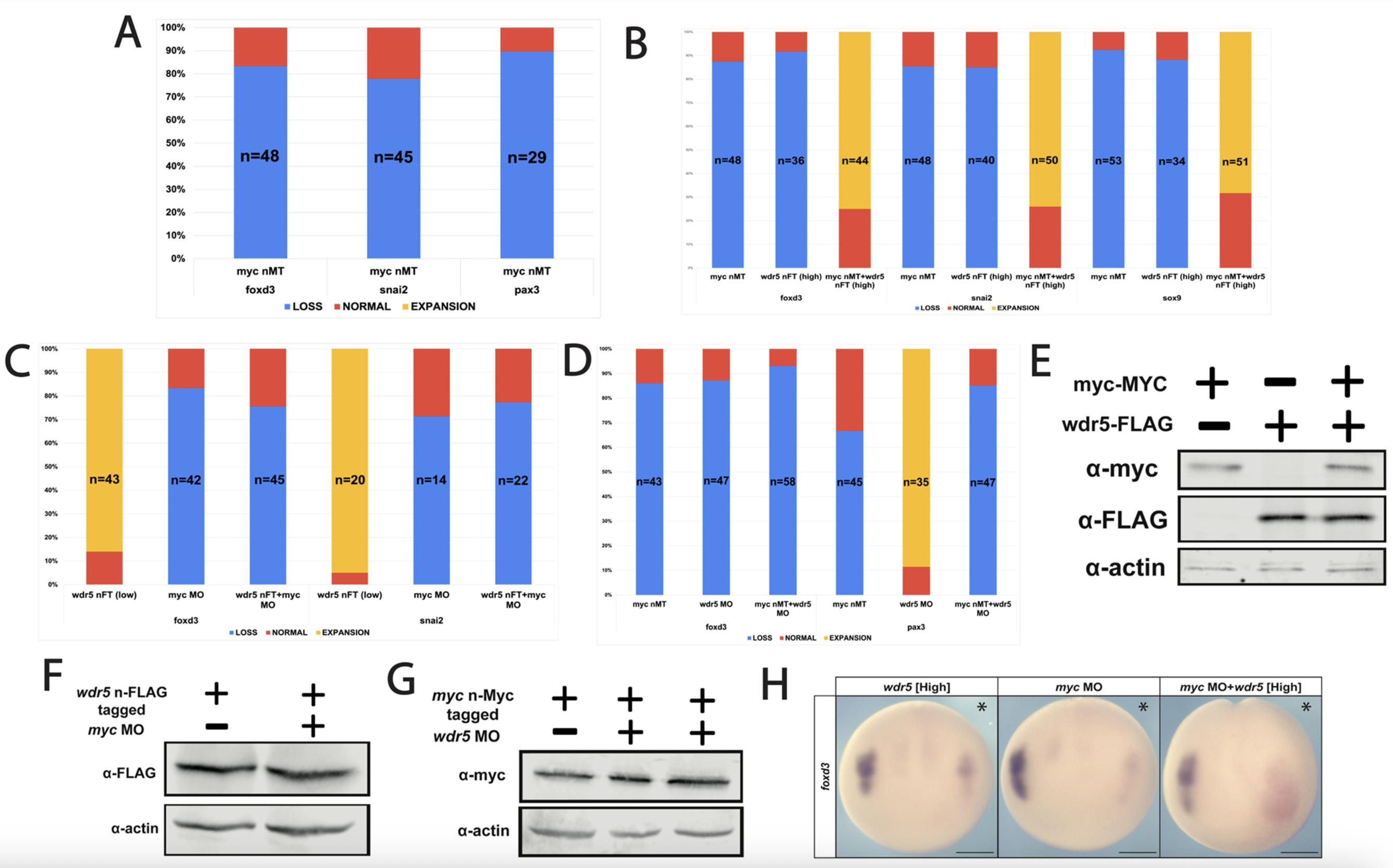 nFT, myc MO, and wdr5 nFT+myc MO injected embryos. (D) Percentage bar graph representing whole embryo phenotype counts for myc nMT, wdr5 MO, and myc nMT+wdr5 MO injected embryos. (E) Western blot depitcing equivalent expression of wdr5-FLAG and myc-Myc in single and co-injection conditions. (F) Western blot depicting persistence of wdr5-FLAG expression in the presence and absence of myc morpholino. (G) Western blot depicting persistence of myc-MYC expression in the presence and absence of wdr5 morpholino. (H) High levels of wdr5 do not require myc expression to inhibit neural crest gene expression. |