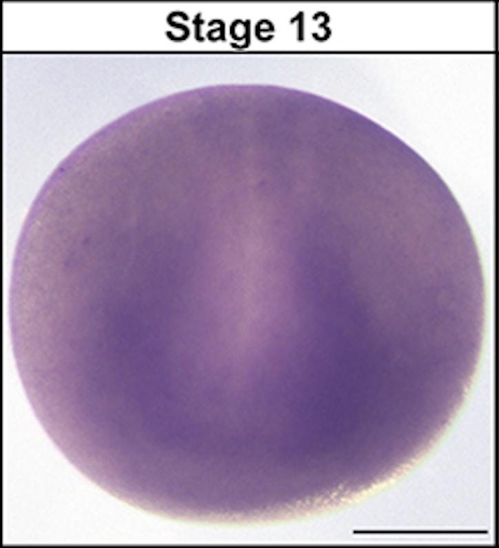 wdr5 (WD repeat domain 5) gene expression in X. laevis embryo, NF stage 13, assayed via in situ hybridization, anterior view, dorsal up. |