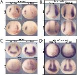 Fig. 3. Overexpression of wdr5 exhibits concentration-dependent effects on neural crest factor expression. (A) Exogenous wdr5 mRNA shows concentration-dependent effects on neural crest gene expression. (B) Increased wdr5 expression expands NPB gene expression independently of mRNA concentration. (C) Exogenous wdr5 mRNA exhibits expanded expression of myc expression and inhibition of six1 expression. (D) Increased wdr5 expression inhibits expression of epidermal keratin factor (krt12.4) and expansion of the neural plate factor sox3 independently of mRNA concentration. Asterisks indicate the injected side of the embryo. Scale bars: 250[micrometers]. |