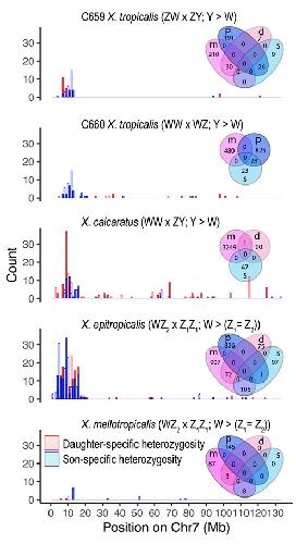 Figure 4.Counts of daughter-specific and son-specific heterozygous positions (defined in the Methods) in 1 Mb windows on chromosome 7 (Chr7) in five families from four Silurana species. Venn diagrams indicate the overlap between maternal-specific (m), paternal-specific (p), daughter-specific (d), and son-specific (s) heterozygous positions in the first 20 Mb of chromosome 7. Pseudoheterozygous positions (discussed in main text) are not expected to be daughter-specific or son-specific, but elevate the numbers of maternal-specific and paternal-specific counts in the Venn diagrams for the three allotetraploid species if one parent is mis-inferred to be homozygous. |