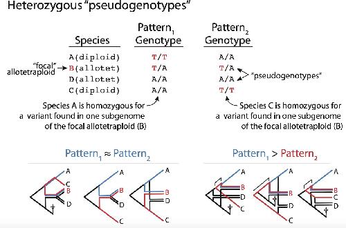 SI Fig. 3. Alternative patterns of homozygous “autapomorphies” in diploid whole genome sequences allow us to test whether one or multiple allotetraploidization events occurred in subgenus Silurana. With species B as the focal allotetraploid, we expect the numbers of Pattern1 and Pattern2 sites to be similar under scenarios where divergence between the focal allotetraploid and each diploid is the same (indicated by pairs of blue branches in the left two phylogenies). Under various scenarios such as the three depicted on the right, more Pattern1 than Pattern2 sites are expected if the diploid sample A is more closely related than C to the focal allotetraploid. We assume here that the effective population size and mutation rates are similar in both diploid species; a dagger indicates an unsampled diploid ancestor. |