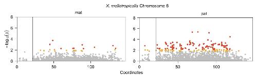 SI Fig. 7. Haplotype plots for X. mellotropicalis of positions on chromosome 7 that are heterozygous in the mother (left) and on chromosome 8 that are heterozygous in the father (right). Son- and daughter-specific maternal heterozygous positions on beginning of chromosome 7 are consistent with a WX mother; son-specific heterozygous paternal positions on chromosome 8 are consistent with additional complexity in the data that may be related to variation in coverage as discussed above in the Supplement. |