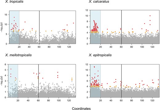 Figure 2.Plots of the probability of association between molecular variation (single nucleotide polymorphisms, SNPs) and sex (female, male) on chromosome 7 evidence conservation of the location of the sex-linked region in all four species in the subgenus Silurana. Gray, orange, and red dots indicate the − log10 transformed probability (p) of tests of the null hypothesis that each SNP is randomly associated with sex, and correspond to > 0.1%, 0.1%–0.05%, or the < 0.05% percentiles, respectively, across genome-wide RRGS variants for each species. Vertical lines indicate the location of the centromere. Results from X. tropicalis and X. mellotropicalis were previously reported (Evans et al., 2024). The signal of sex association on Chr7 in X. mellotropicalis is weak but was previously confirmed using Sanger sequencing (Cauret et al., 2020). |