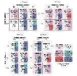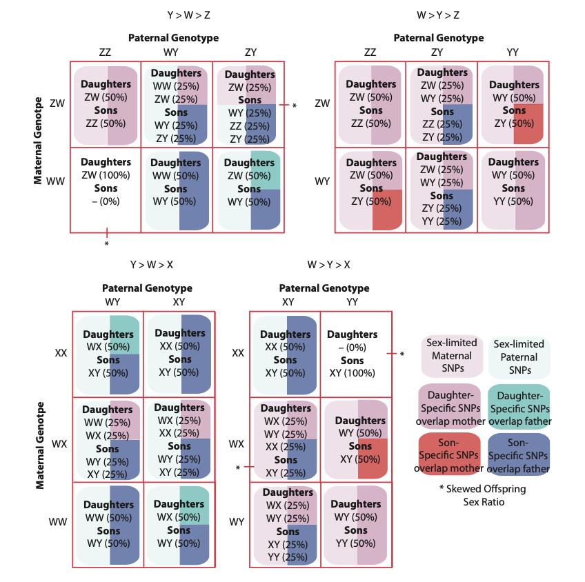 SI Fig. 1. Expectations associated with parental crosses in four types of triple sex chromosomesystems including (top left) Y dominant for maleness over the W and with a Z chromosome, (top right) W dominant for femaleness over the Y and with a Z chromosome, (bottom left) Y dominant for maleness over the W and with an X chromosome, and (bottom right) W dominant for femaleness over the Y and with an X chromosome. As indicated by the legend, colors on the right indicate whether maternal, paternal, or no parental sex-limited SNPs (no color) expected; colors on the left indicate whether daughter-specific and/or son-specific SNPs are expected to overlap with maternal or paternal sex-linked SNPs. The scenario on the top right is genetically equivalent to a scenario with a W chromosome and two diverged Z chromosomes (Z1, Z2), as depicted on the right side of Fig 1. Likewise, the scenario on the bottom left is genetically equivalent to a scenario with a Y chromosome and two diverged X chromosomes (X1, X2). |