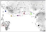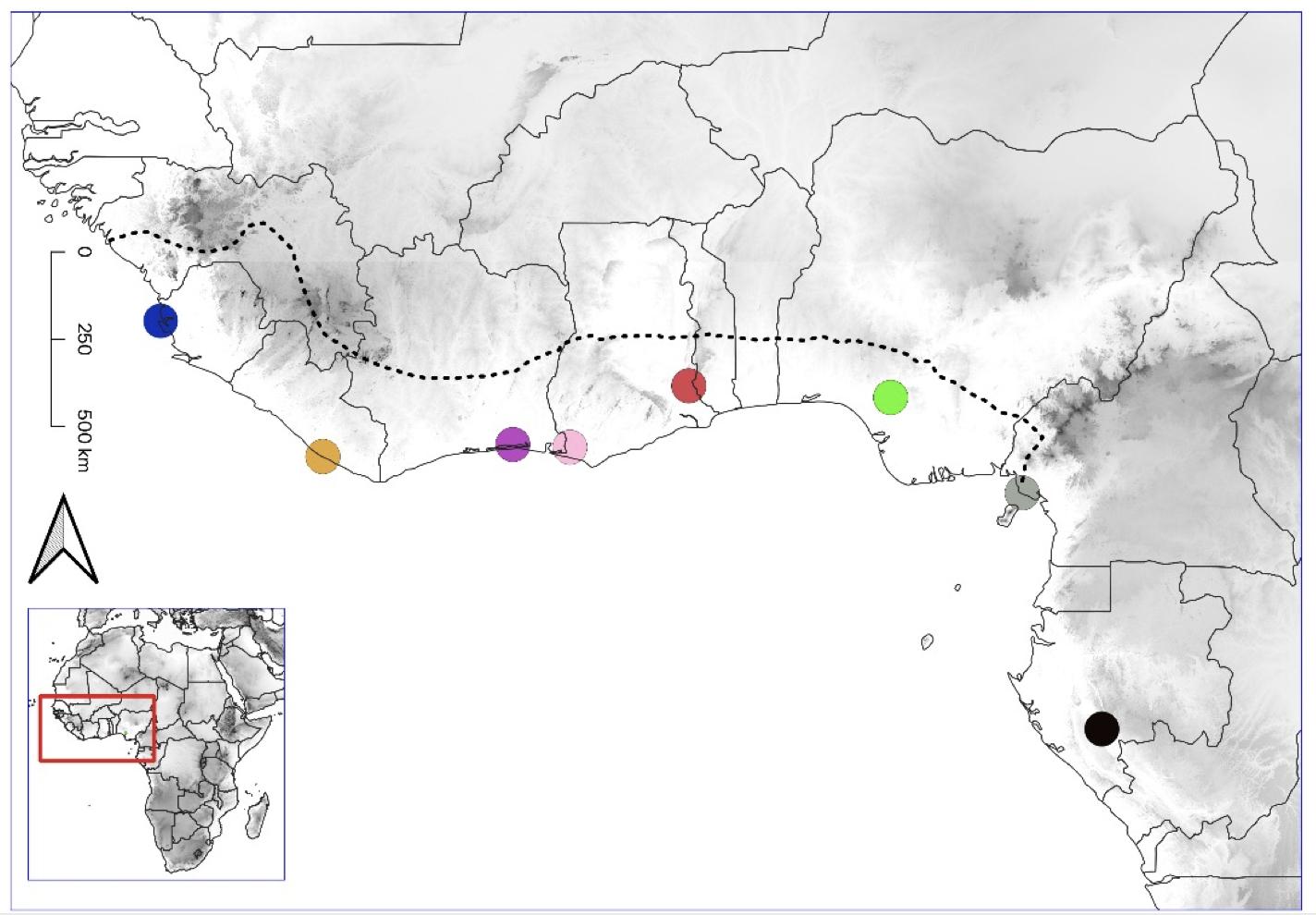 SI Fig. 2. Geographical origins of wild-caught and captive Xenopus samples used for WGS, with detailed locality information provided in Table S1 and colors follow SI Fig. 10. The dotted line demarcates the approximate distribution of Xenopus tropicalis inferred by Tinsley et al. (1996). |