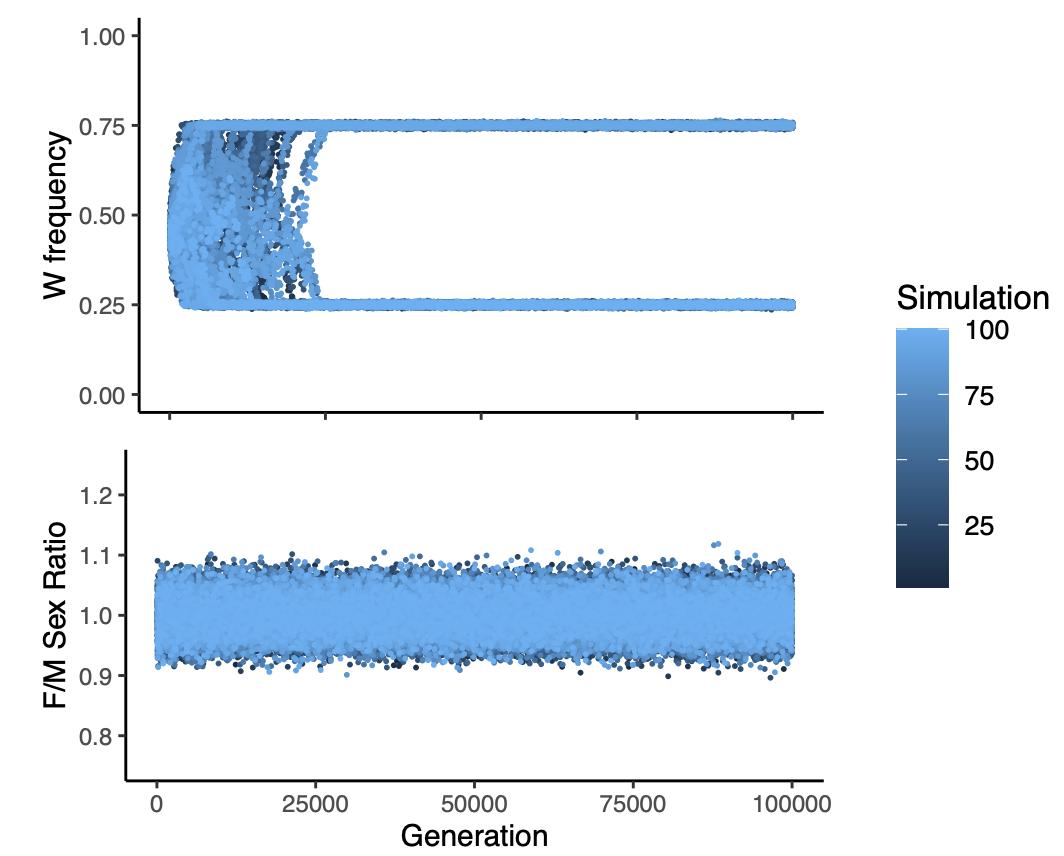 SI Fig. 8. Simulations indicate that a triple sex chromosome system with the Y dominant for maleness over the W drifts to either of two sex chromosome systems (top panel): a ZW/ZZ system where the frequency of the W chromosome is 0.25 (52 simulations) or a WW/WY (= XX/XY) system where the frequency of the W chromosome is 0.75 (48 simulations). Even while all three sex chromosomes are still segregating, the female:male (F/M) sex ratio rapidly converges to one (bottom panel). |