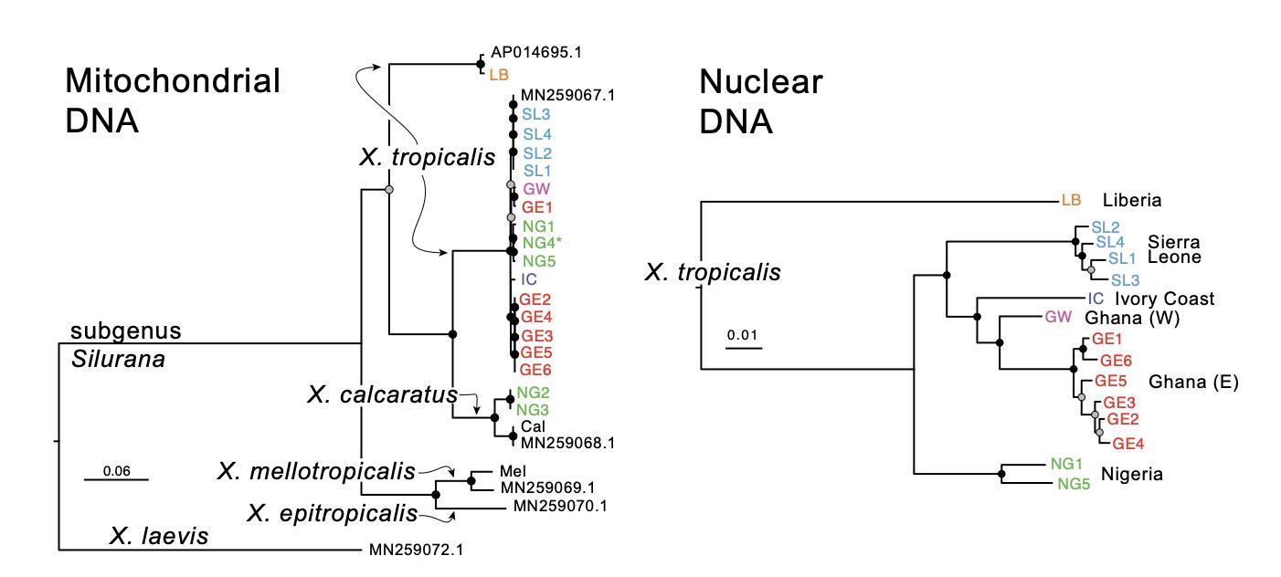 SI Fig. 9. Estimated phylogenetic relationships among assembled mitochondrial genomes of samples from subgenus Silurana and GenBank accessions (left) and of subsetted variable positions in the nuclear genome of X. tropicalis samples (right). Gray and black dots over nodes indicate bootstrap support over 70 and 90 respectively. In the mitochondrial phylogeny an asterisk highlights a putative X. tropicalis / X. calcaratus hybrid that carries a X. tropicalis mitochondrial genome, and some genomes are represented by accession numbers including AP014695.1, which is the accession from the Asashima line (Haramoto, et al. 2016). Scale bar for the nuclear phylogeny refers to rate of evolution of variable sites rather than of all sites. |