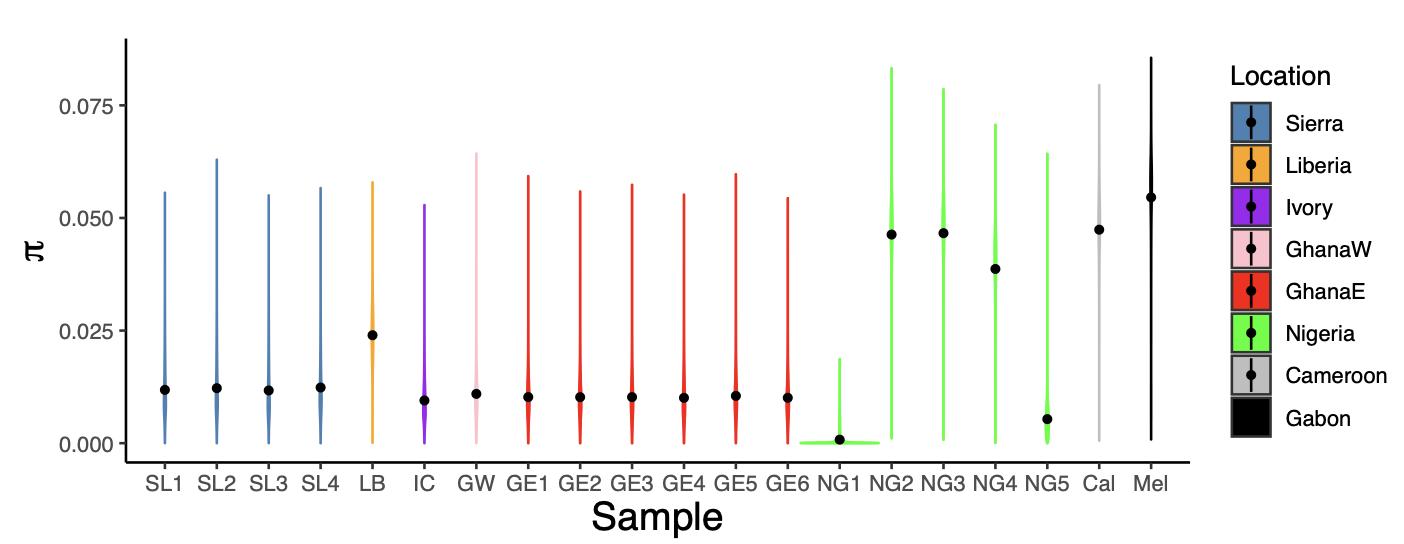 SI Fig. 10. Individual pairwise nucleotide diversity (p) based on whole genome sequencing data for each WGS sample in this study. All individuals with average heterozygosity (dots) below 0.03 have mitochondrial genomes from X. tropicalis and/or the Liberia strain. Those with average392 heterozygosity above 0.03 have X. calcaratus mitochondrial DNA except for NG4, which had X. tropicalis mitochondrial DNA. Diversity of reads mapped to the X. tropicalis reference is also shown for each of two allotetraploids X. calcaratus (Cal) and X. mellotropicalis (Mel). Sample abbreviations are defined in Table S1. |