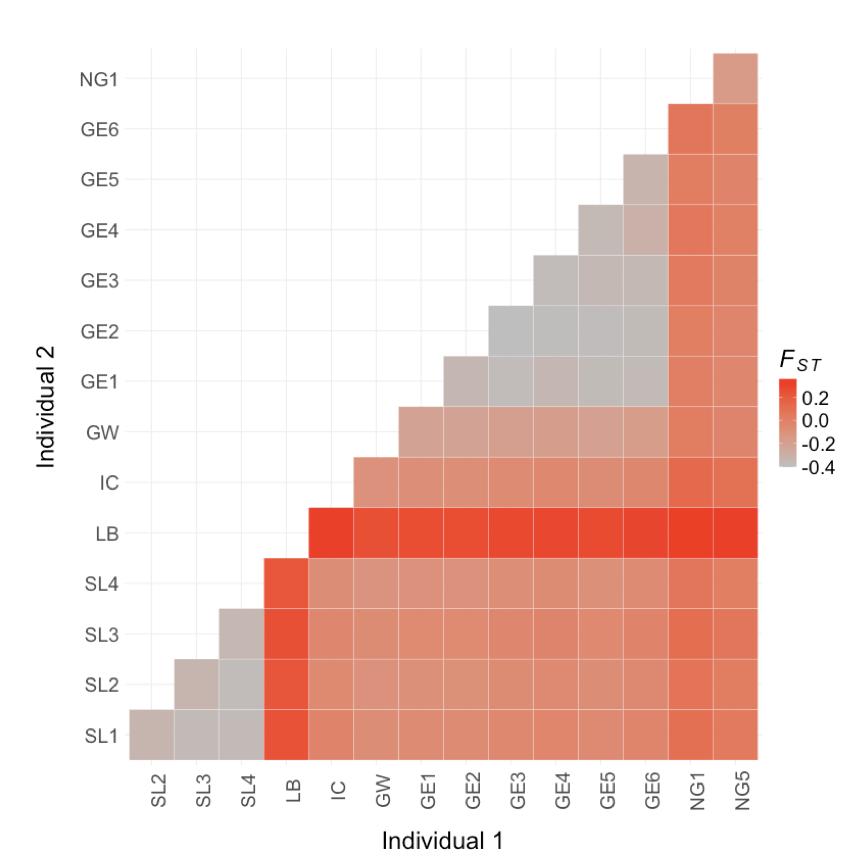 SI Fig. 15. A heatmap of the average pairwise FST in 5 Mb windows between whole genome sequences of X. tropicalis mapped to the X. tropicalis reference genome illustrates strong differentiation of the sample from Liberia. Sample abbreviations are defined in Table S1. |