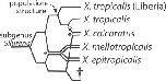 Figure 6.Inferred phylogenetic history of subgenus Silurana, genus Xenopus. Asterisks indicate independent allotetraploidization events, and a female symbol indicates the maternal ancestral lineage for one of these events based on the mitochondrial phylogeny. The sister relationship between X. mellotropicalis and X. epitropicalis is based on mitochondrial genomes and cloned paralogs of the autosomal genes RAG1 and RAG2 (Evans, 2007; Evans et al., 2005; Evans et al., 2019). Two site pattern tests summarized in Tables 3 and 4 and described in the Supplementary material support (a) allotetraploidization of the ancestor of (X. mellotropicalis + X. epitropicalis) before population structure arose in X. tropicalis and (b) allotetraploidization of the ancestor of X. calcaratus after the Liberia lineage became differentiated from other X. tropicalis. A dagger indicates a putative unsampled diploid ancestor. |