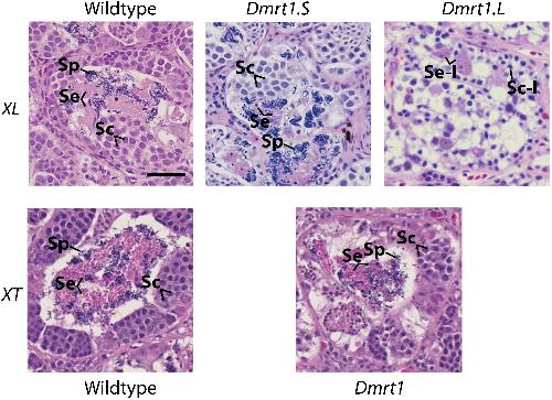 Fig 2. Testis histology of wildtype and knockout lines for X. laevis (XL) and X. tropicalis (XT) dmrt1.L, dmrt1.S, and dmrt1.