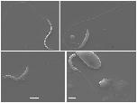 [Supplementary Figures] Fig D. Scanning electron microscopy images of wildtype sperm (top left) and sperm from X. laevis homozygous knockout for dmrt1.L. Scale bars are 5[micrometers].
