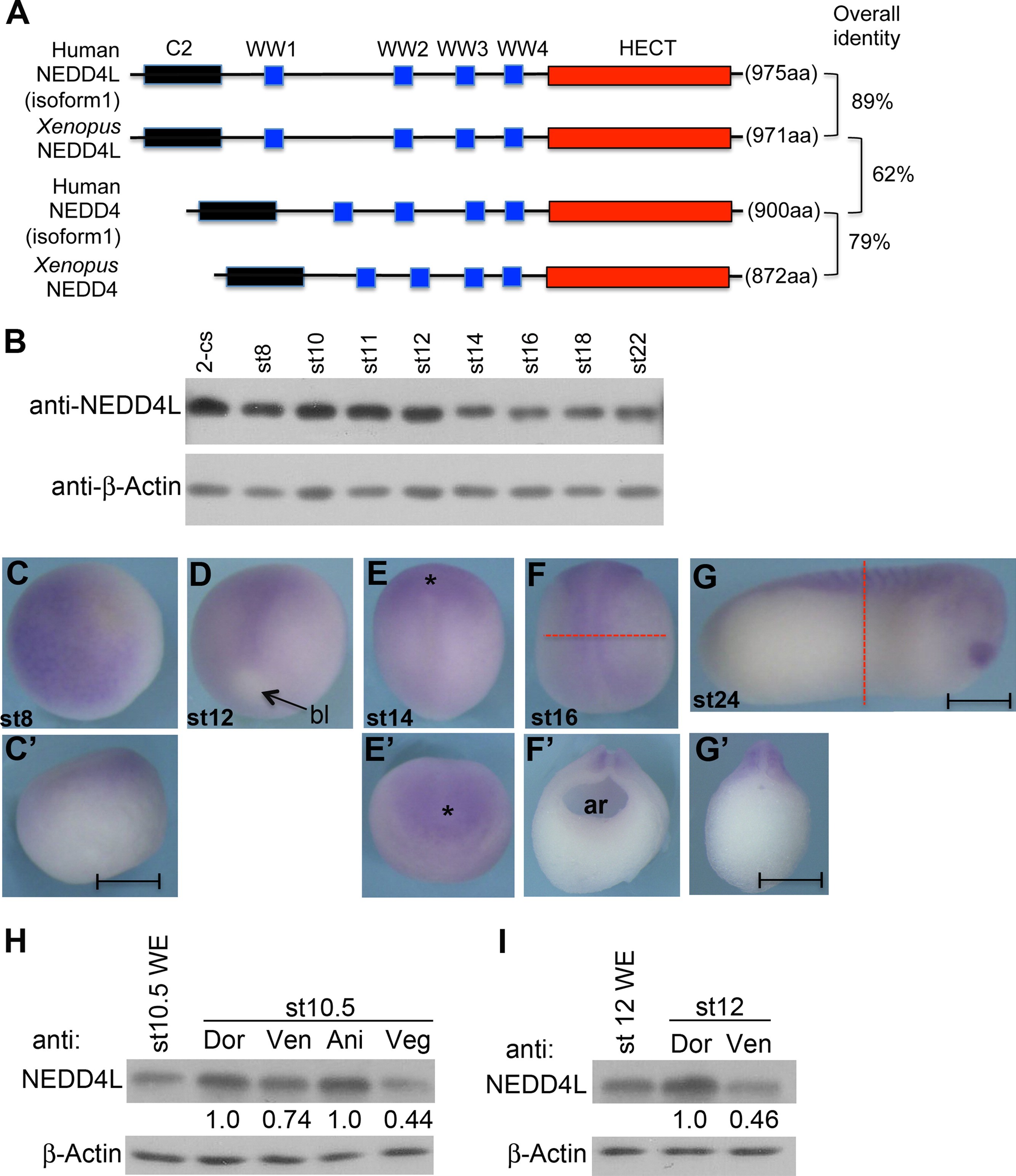 | Larger Image Fig. 1. The spatialâtemporal expression pattern of NEDD4L during Xenopus embryonic development. (A) Schematic depiction of xNEDD4L encoding an evolutionarily conserved HECT E3 ligase closely related to NEDD4. The number of amino acid residues of each protein is indicated. (B) The expression of Xenopus NEDD4L during cleavage (2-cs), blastula (st8), gastrula (st10â12), neurula (st14â22) stages assessed by Western blot using a specific antibody directly against xNEDD4L. β-Actin serves as a loading control. (CâG) Whole mount in situ hybridization for xNEDD4L. (C) Animal view at st8; (C׳) lateral view at st8. (D) Dorsal view at st12 (bl: blastopore). (E) Dorsal view at st14; (E׳) anterior view at st14 (â asterisk indicates anterior neural fold); (F) dorsal view at st16; (F׳) transversal section view at the level indicated by red dashed line in F (ar: archenteron); (G) lateral view at st24; (G׳), transversal section view at the level indicated by red dashed line in G. Scale bar: 1 mm. (H, I) Western blotting assessments of the distribution of NEDD4L protein in the early gastrula (st10.5, H) and late gastrula (st12, I). Embryos at st10.5 were dissected into animal (Ani) and vegetal (Veg) halves, or dorsal (Dor) and ventral (Ven) marginal zones. Embryos at st12 were dissected into dorsal (Dor) and ventral (Ven) marginal zones. β-Actin serves as a loading control. Image published in: Zhang Y et al. (2014) Copyright © 2014. Image reproduced with permission of the Publisher, Elsevier B. V.