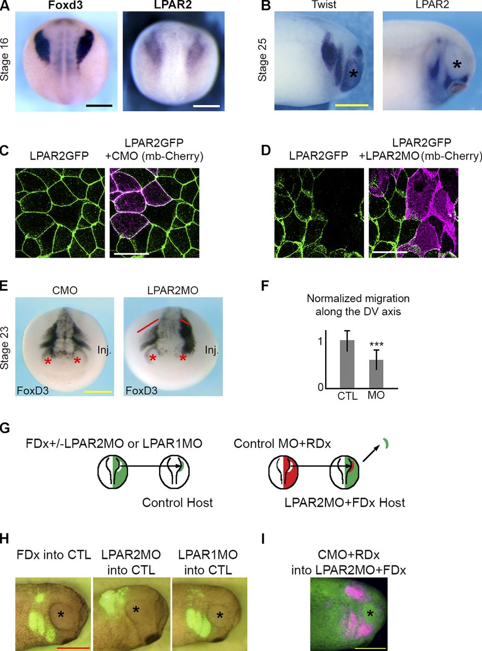 Larger Image Figure 1. LPAR2 signaling is required for in vivo NC migration. (A) In situ hybridization for Foxd3 and LPAR2. (B) In situ hybridization for Twist and LPAR2. Asterisks indicate eyes. (C) Control Morpholino coinjected with membrane-mCherry into animal caps expressing 5â²UTR-LPAR2GFP. (D) LPAR2 Morpholino coinjected with membrane-mCherry into animal caps expressing 5â²UTR-LPAR2GFP. Note the absence of LPAR2-GFP fluorescence in the cell injected with LPAR2MO. (E) Frontal view of embryos injected with Control MO (CMO) or LPAR2MO, Foxd3 in situ hybridization. Asterisks, eyes; Inj., injected side; red lines, normal migration in control side. (F) LPAR2MO-injected embryos have NC migration defects (41 embryos were analyzed). Studentâs t test (two-tailed): ***, P < 0.005; errors bars indicate SD. (G) Grafting procedure. (H) Graft of control (left) or LPAR2MO (middle) or LPAR1MO cells (right) labeled with FDx (green) into host embryos. (I) Graft of control NC cells labeled with rhodamine-dextran (RDx, red) into LPAR2MO host (FDx, green). Bars: (A, B, E, H, and I) 0.5 mm; (C and D) 100 µm. Image published in: Kuriyama S et al. (2014) © 2014 Kuriyama et al. Creative Commons Attribution-NonCommercial-ShareAlike license