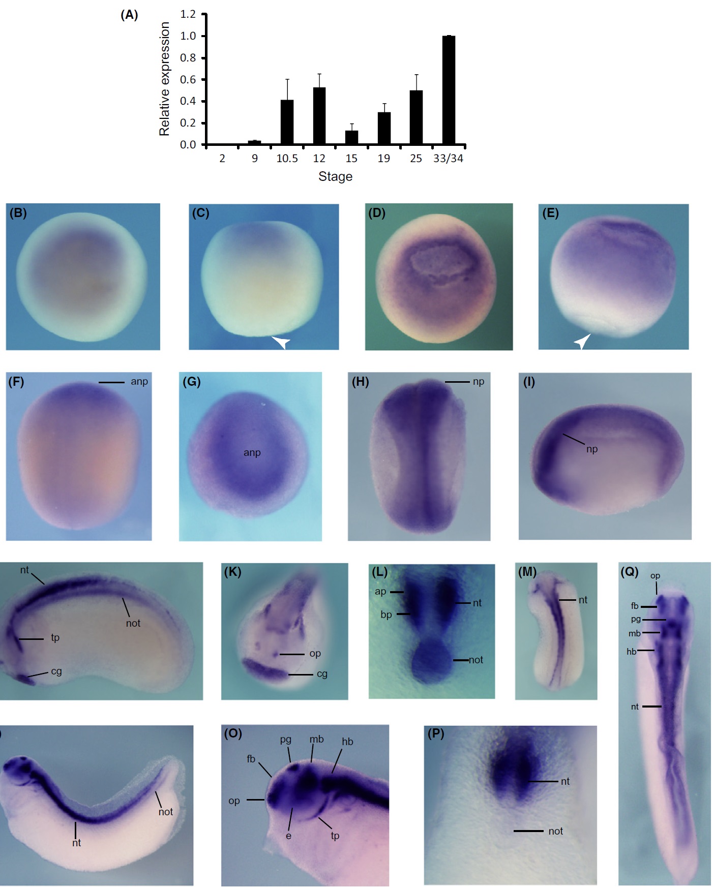 Larger Image Figure 1 Expression of cnrip1 in early Xenopus development. (A) qRT-PCR analysis of cnrip1 mRNA expression during Xenopus development. The expression level of cnrip1 was normalized to that of ornithine decarboxylase (odc). The bar graph indicates the average ratio of the normalized expression level in each stage to that in stage 33/34, from three independent experiments. The error bar represents SD. (BâQ) Whole-mount in situ hybridization for cnrip1 mRNA at stage 10.5 (B, C), 12 (D, E), 15 (F, G), 19 (H, I), 25 (J-M), 33/34 (N-Q). (B, D) Animal views. (C, E) Lateral views with blastopores downwards (arrowheads). (F, H, M, Q) Dorsal views with anterior upwards. (G, K) Anterior views with dorsal upwards. (I, J, N) Lateral views with dorsal upwards and anterior leftwards. (L) A transverse trunk section of the middle part of a stage 25 embryo. (O) A magnified view of the stage 33/ 34 embryo shown in N. (P) A transverse trunk section of the middle part of a stage 33/34 embryo. anp, anterior neural plate; np, neural plate; nt, neural tube; not, notochord; cg, cement gland; tp, trigeminal placode; op, olfactory placode; fb, forebrain; pg, pineal gland; mb, midbrain; hb, hindbrain; e, eye; ap, alar plate; bp, basal plate. Image published in: Zheng X et al. (2015) Copyright © 2015. Image reproduced with permission of the Publisher, John Wiley & Sons.