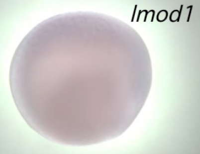 Larger Image lmod1 (leiomodin 1 (smooth muscle)) gene expression in Xenopus laevis embryo, assayed via in situ hybridization, NF stage 15, lateral view, anterior left, dorsal up. This image is extracted from figure published in: Nworu CU et al. (2015), Image published in: Nworu CU et al. (2015) Copyright © 2015. Image reproduced with permission of the Publisher, The Company of Biologists Ltd.