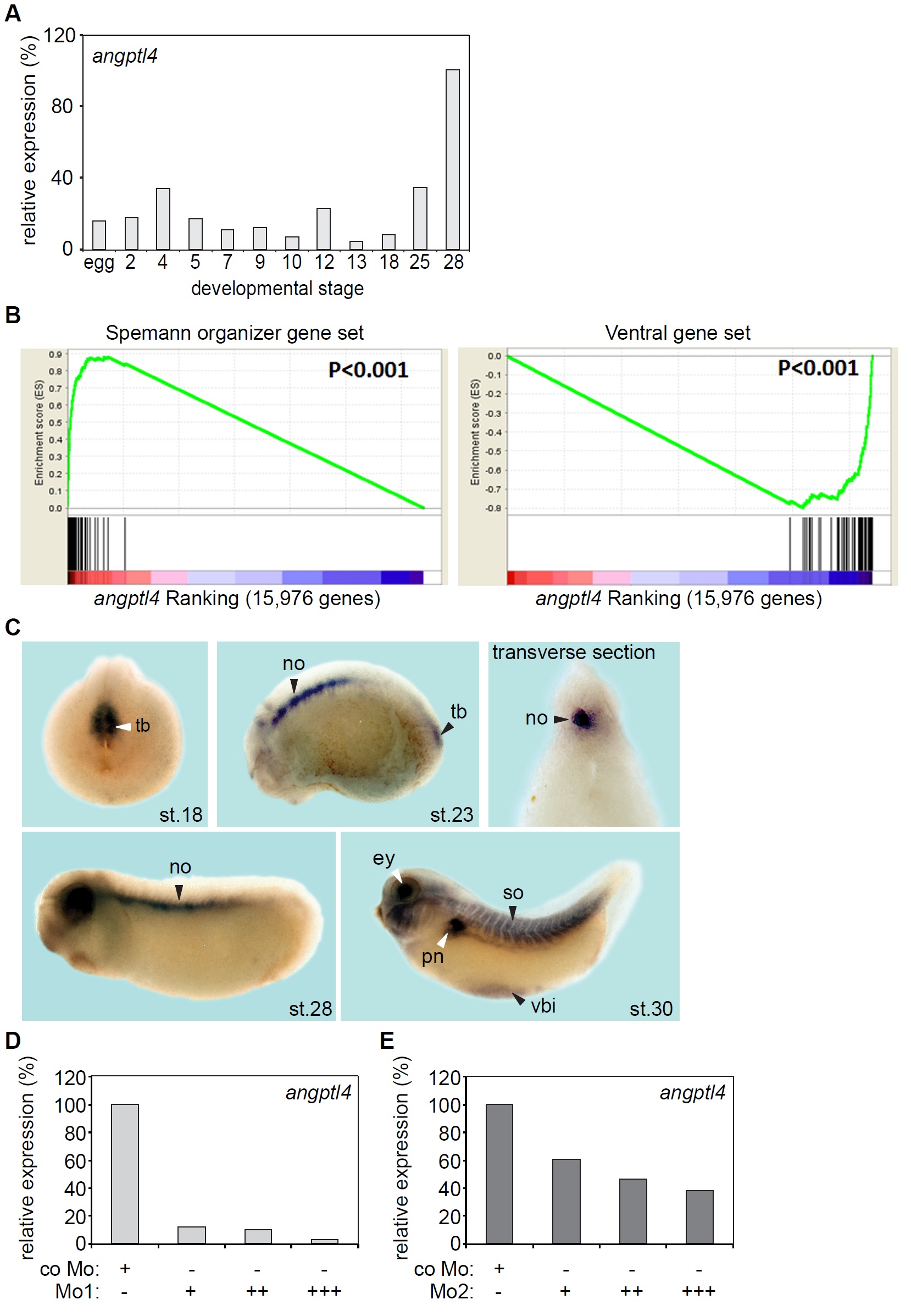 Larger Image Figure S2, related to Figure 2. Angptl4 is expressed in Spemann organizer, notochord, somites and eye of Xenopus embryos. (A) qRT-PCR analysis of angptl4 in X. tropicalis embryos at different developmental stages. Ornithine decarboxylase (odc) was used for normalization. (B) Left, gene Set Expression Analysis (GSEA, Subramanian et al., 2005) showing that a set of 107 X. laevis Spemann organizer-specific genes (Ding et al., 2017) strongly correlated with genes from six dorsal-ventral libraries comprising 15,976 genes ranked according to their correlation with angptl4. Right panel, a set of 70 ventral lip-specific genes (identified in Ding et al., 2017) was inversely correlated with angptl4. This data mining confirms that angptl4 is expressed in the Spemann organizer, the precursor of the notochord, at early gastrula (st.10.5). (C) Whole-mount in situ hybridization of angptl4 mRNA in X. tropicalis embryos at the indicated stages. Tb, tailbud mesoderm; no, notochord; ey, eye; pn, pronephros; so, somites; vbi, ventral blood island. (D, E) qRT-PCR analysis of angptl4 in X. tropicalis embryos at stage 11 that were injected with two different angptl4 antisense splice-site (Mo1 (D), Mo2 (E)) or control (co) Morpholinos (Mo). Two different primer pairs were used to analyze exon skipping of Mo1 or Mo2 respectively. Image published in: Kirsch N et al. (2017) Copyright © 2017. Image reproduced with permission of the Publisher, Elsevier B. V.