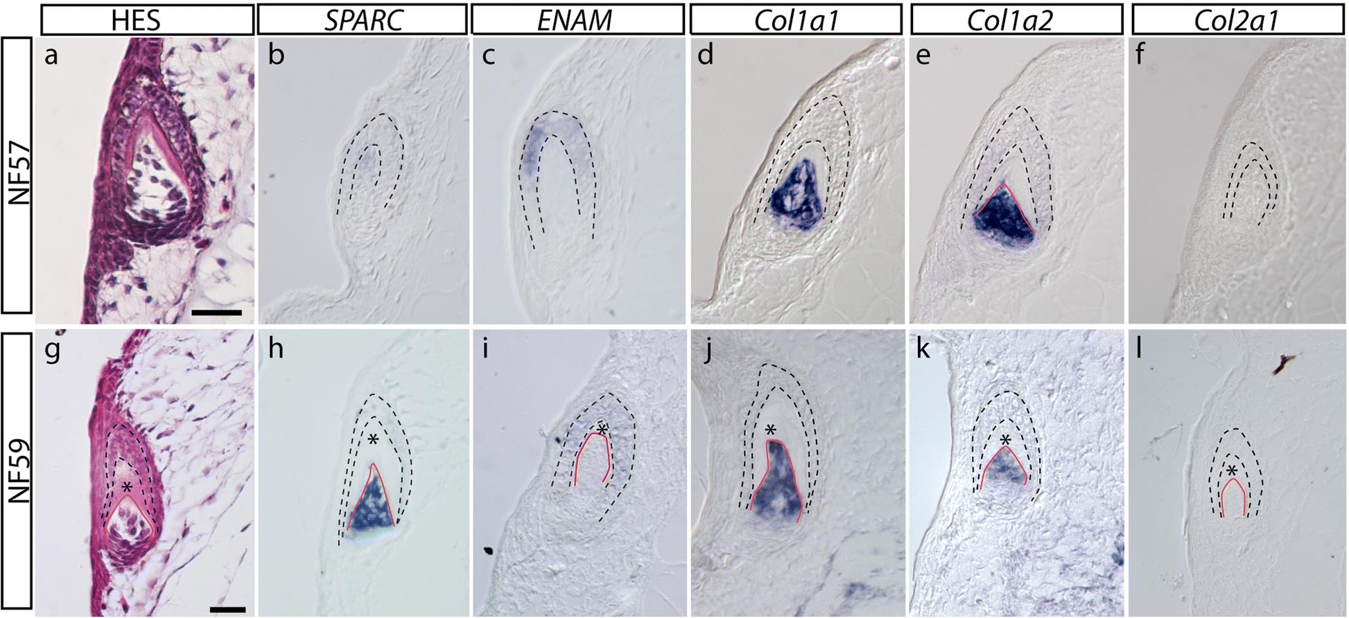 | Larger Image Fig. 3 Histology and gene expression in developing teeth of Xenopus tropicalis. Longitudinal sections of the X.t. upper jaw at the NF57 developmental stages were stained with HES (a, g) or processed by in situ hybridization for the indicated genes (b-f and h-l). Ameloblasts and odontoblasts are delineated by black dotted lines or by an orange line, respectively. The asterisks locate the mineralized matrix. The scale bars in (a) and (g) respectively represent 20 μm in (a-f) and (g-l) Image published in: Enault S et al. (2018) © The Author(s). Creative Commons Attribution license