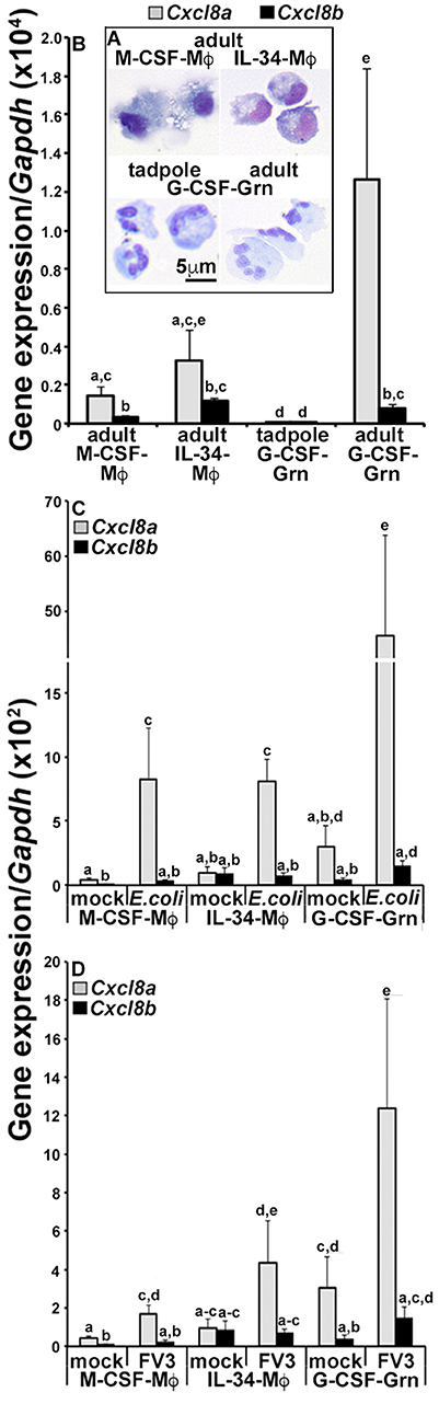 Larger Image Figure 3. Analyses of CXCL8a and CXCL8b gene expression in frog macrophages and granulocytes. (A) Cytology of tadpole rG-CSF-elicited peritoneal granulocytes (G-CSF-Grn) and adult frog bone marrow-derived macrophages, differentiated with rM-CSF (M-CSF-MÏ) or rIL-34-MÏs (L-34-MÏ) and granulocytes (Grn), differentiated with rG-CSF (G-CSF-Grn). (B) The adult frog M-CSF-MÏ, IL-34-MÏ, and G-CSF-Grn were examined for their steady state gene expression of Cxcl8a and Cxcl8b. (C) The adult frog M-CSF-MÏ, IL-34-MÏ, and G-CSF-Grn were either mock infected (saline) or challenged with FV3 at a multiplicity of infection of 0.5 PFU/cell. After 24 h of challenge, cells were examined for Cxcl8a and Cxcl8b gene expression relative to Gapdh (N = 5). (D) M-CSF-MÏ, IL-34-MÏ, and G-CSF-Gran were mock challenged (saline) or challenged with heat-killed E. coli for 24 h before Cxcl8a and Cxcl8b gene expression analysis, relative to Gapdh (N = 5). All results are presented as means + SEM. Above-head letters denote statistical designations: experimental groups described by distinct letters are statistically different (P < 0.05) while those marked by the same letters are not. Image published in: Koubourli DV et al. (2018) Copyright © 2018 Koubourli, Yaparla, Popovic and Grayfer. Creative Commons Attribution license